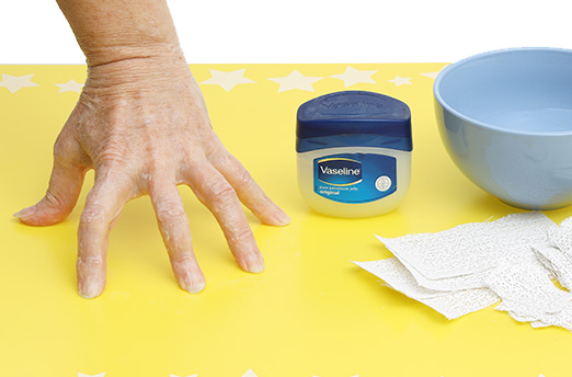 Arbeitsunterlage und Wasserschüssel vorbereiten. 2 Rollen Gipsbinden in verschieden große Stücke schneiden. Entweder die eigene Hand abformen oder im Zweierteam arbeiten. Haut reichlich mit Fettcreme wie zB. Vaseline oder Nivea eincremen. Die Hand so mit den Fingern auf die Arbeitsunterlage stellen, dass sie später einen stabilen Stand hat. Also Daumen und Zeigefinger nach hinten setzen.