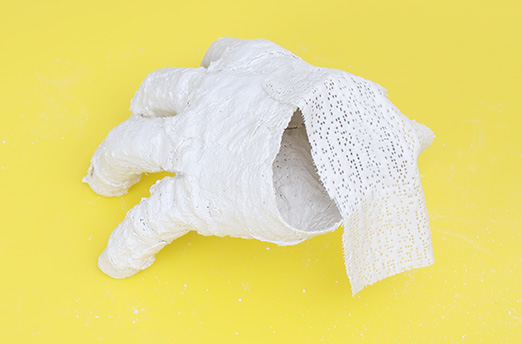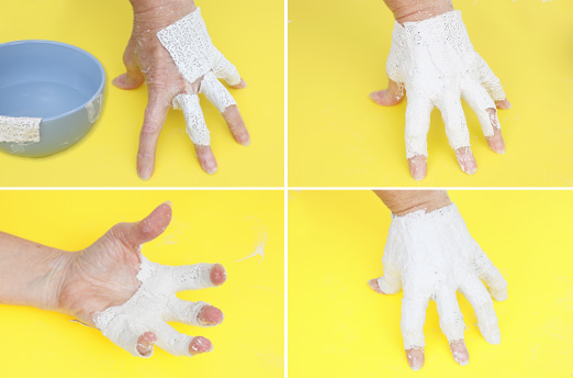 Gipsbinden kurz in Wasser tauchen, abstreifen und locker um die Hand legen. Nicht über das Handgelenk wickeln, da die Hand sonst nicht mehr herausgezogen werden kann! Zuerst Handflächen und Finger arbeiten, zuletzt die Fingerspitzen. Die Hand sollte dabei immer in derselben Position bleiben. Sobald der Gips leicht angetrocknet ist, die Hand behutsam lockern und langsam herausziehen. Standfestigkeit testen, Korrekturen vornehmen, Risse mit Gipsbinden verschließen. 1 – 2 Tage durchtrocknen lassen