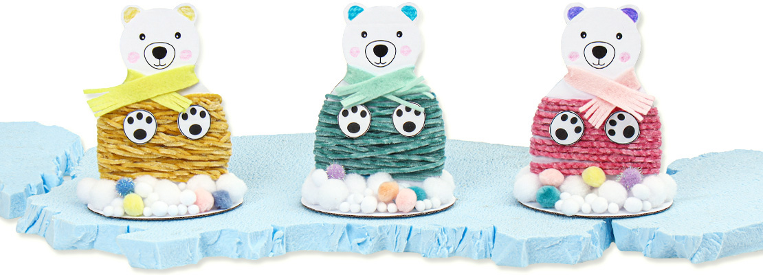 Das Wickeln mit der flauschig weichen Samtwolle ist nicht nur eine lustige Motorikübung sondern auch ein tolles sensorisches Erlebnis. Alternativ können die kleinen Eisbären auch mit einer Schnur aus der Strickgabel oder einer Luftmaschenkette warm angezogen werden, und auf einer Eisscholle aus Styropor fühlen sie sich so richtig wohl!
