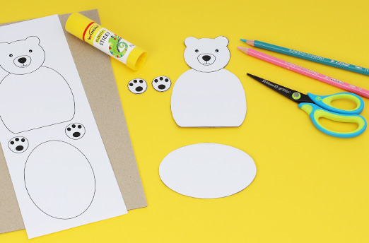 Vorlage ausdrucken und mit Klebestift auf den Bastelkarton kleben. Bei platzsparender Anordnung reicht ein Karton zum Basteln von 4 Eisbären. Alle Teile ausschneiden. Wangen und Ohren des Eisbären mit Farbstiften bemalen.