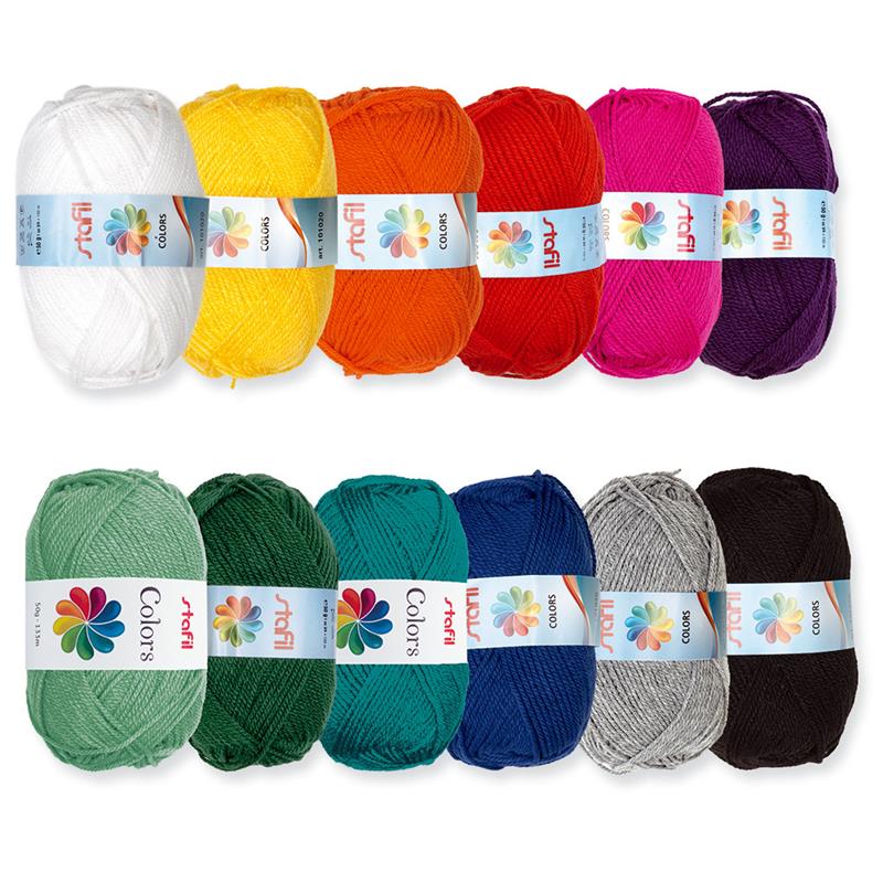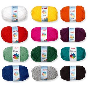 Made in Italy. Ideale Schulwolle, vielfach verwendbar, maschinenwaschbar. Mischpackung in 12 kräftigen Farben. Stärke: ∅ ca. 2,5 mm Lauflänge: je ca. 130 m (50 g/Knäuel) = ca. 1.560 m Nadelstärke: 3 – 3,5 Material: 100 % Polyacryl Waschbar: 30 °C Maschenprobe 10 x 10 cm: Breite 20 M., Höhe 28 R.