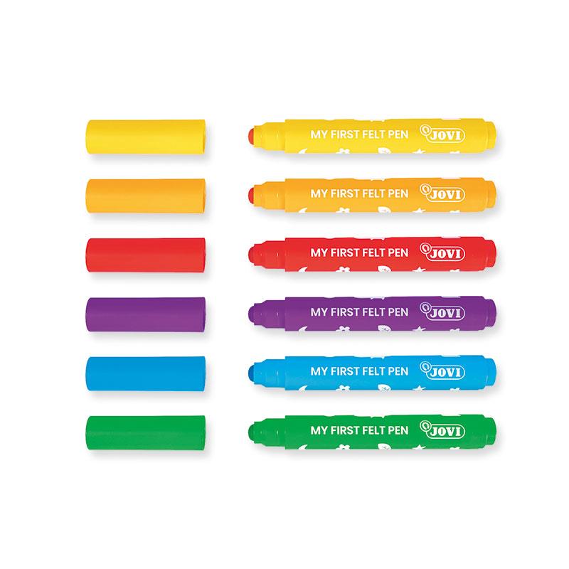 A legkisebbek számára készült filctoll, ideális méretének és az érzékeny, ellenálló hegyének köszönhetően, amely lehetővé teszi színes rajzok készítését. Könnyen lemosható a kézről és a ruhákról (96 órán át). Biztonsági, szellőző kupakkal ellátva. 6 különböző szín a gazdaságos csomagban. Tollvastagság: ∅ 14 mm Tollhossz: 135 mm Vonalszélesség: kb. 2 – 3 mm