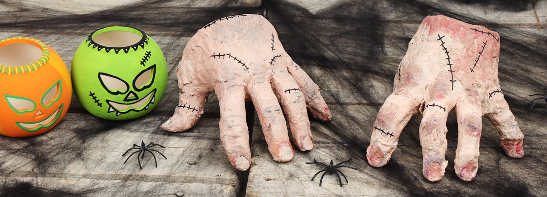 Gruselig-lustiger Bastelspaß! Die eigene Hand oder die des Sitznachbarn abzuformen, ist nicht nur ein tolles, haptisches Erlebnis, sondern macht auch richtig Spaß. Ganz nebenbei werden Materialkenntnisse vermittelt und dreidimensionales Gestalten sowie soziale Kompetenzen gefördert.