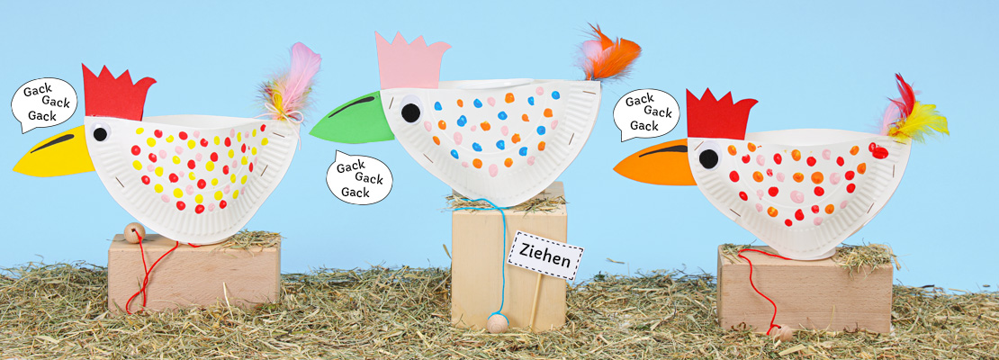 Diese fröhlichen Hühner mit witzigem Soundeffekt begeistern Groß und Klein und sind schnell gebastelt. Mit einem Joghurtbecher, einem Baumwollgarn und einer Holzkugel entsteht das lustige „Gacker-Geräusch“, während der Körper aus einem Pappteller gestaltet wird. Beim Schneiden, Kleben und Zusammenbauen werden die Feinmotorik, Kreativität und Konzentration geschult. Das fertige Huhn sorgt für Stolz, gute Laune und lädt zum Spielen ein.